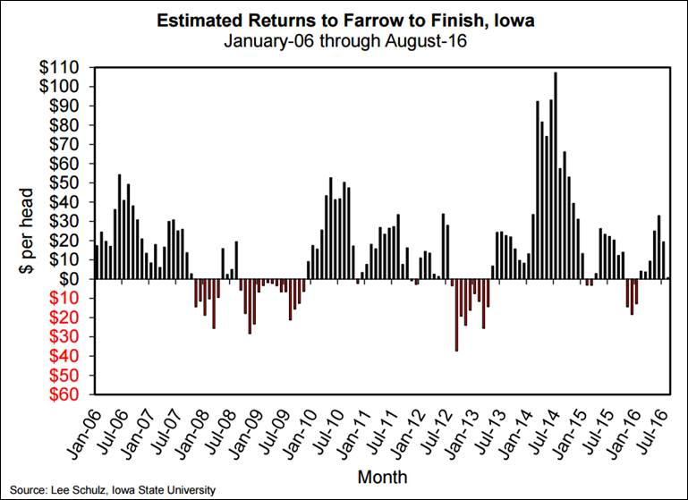 En Iowa (32% du porc US), les producteurs de porc étaient au seuil de la profitabilité durant le mois d’août, on peut donc déduire que leur coût de production se situe près de 65 - 67 ¢/lb (environ 176 $CA/100kg). La moyenne des prix pour les prochains 12 mois est de 58.8 ¢/lb (157 $CA/100kg), ça ne s’annonce pas meilleur aux États-Unis qu’ici finalement. Cela pourrait affecter les intentions de mises-bas, mais d’avantage pour le rapport Hogs & Pigs de décembre que celui de septembre. Il ne faut toutefois pas oublier qu’environ 32% de la production américaine provient directement des «packers » qui pourraient être tenté d’augmenter leur production, contrairement aux éleveurs qui représentent le 2/3 de la production américaine.