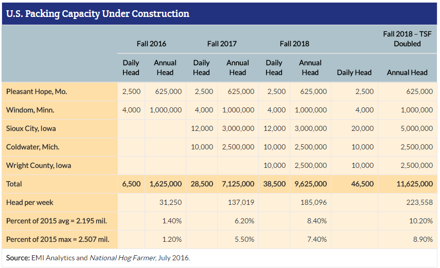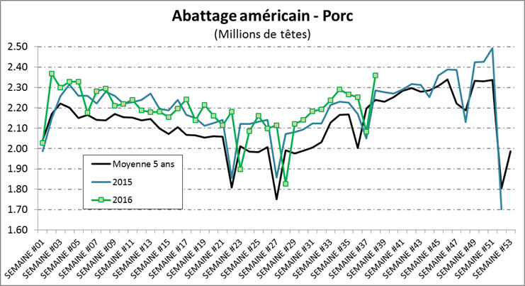 L’abondance de porcs face à la capacité limitée d’abattage permet aux abattoirs de dégager des marges quasi-records, présentement à 49 $US/tête (64 $CA/tête). Toutefois, comme toute industrie profitable, des investissements ont été faits afin d’accroître la production ce qui fera augmenter la compétition entre les acheteurs dès 2017. Deux abattoirs à surveiller pour l’an prochain : 1) Celui de Seaboard et Triumph Foods, à Sioux City en Iowa, qui devrait ouvrir à l’été 2017 pour une production journalière de 12,000 porcs; 2) Celui de Clemens Food, à Coldwater au Michigan, qui devrait ouvrir à la fin de 2017 avec une production de 10,000 porcs par jour. Dès l’an prochain, la capacité d’abattage hebdomadaire augmentera de 137,000 porcs versus 2015. En 2018, un abattoir additionnel devrait ouvrir à Wright County en Iowa pour 10,000 porcs par jour. Aussi, une deuxième ligne d’abattage devrait être ajoutée à l’abattoir de Seaboard et Triumph Food ce qui ajoutera 8,000 porcs par jour à la nouvelle usine pour un total de 20,000 porcs/jour. En somme, la capacité d’abattage devrait augmenter de 185,000 à 223,500 porcs/semaine d’ici 2 ans ce qui pourrait faire réduire l’écart entre le prix de la carcasse découpée et celui du porc livré.