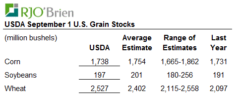 Rapport USDA sur les inventaires de grain (stock de report). Résultat près des estimés pour le maïs et soja, mais plus de blé que prévu.