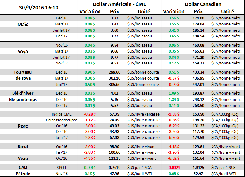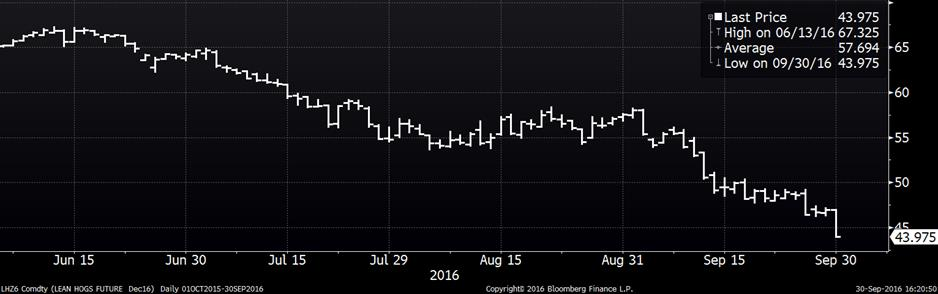 Le sentiment du marché était très négatif en attente du rapport trimestriel Hogs & Pigs puisque les prix d’octobre, décembre et février ont touché la limite baissière de -3 ¢/lb pendant la séance. Le prix de décembre a terminé la journée à son plus bas niveau, en baisse de 6% à 43.97 ¢US/lb, l’équivalent de 118 $CA/100kg. En plus de cette journée négative, le rapport trimestriel a dévoilé plus de porcs qu’anticipé ce qui pourrait faire prolonger la tendance baissière des prix.