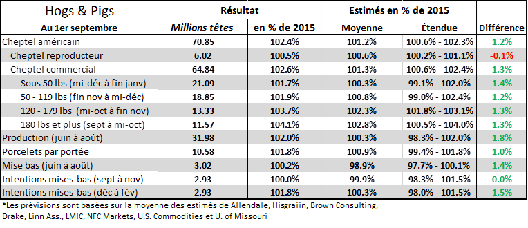 Le cheptel américain totalise 70.85 millions de porcs ce qui est le plus gros cheptel que les américains ont jamais eu. Il y a 6.02 millions de truies, cochettes et verrats gardés pour la reproduction ce qui représente une augmentation de 0.5% de plus qu’au 1er septembre 2015, en ligne avec les estimés. C’est au niveau du cheptel commercial que l’augmentation s’est avérée plus importante que prévue, de l’ordre de +2.6%, alors que les analystes prévoyaient en moyenne +1.3%. Même l’analyste le plus agressif ne prévoyait pas une augmentation si élevée du cheptel commercial.
