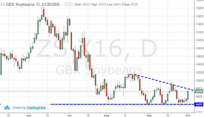 Progression de la récolte : maturité complète à 83% un peu en avance tandis que 26% serait récolté. Les récoltes sont dans les moyennes, mais on demeure nettement sous le rythme de l'an passé. Les conditions ont encore augmentées de 1% et atteignent 74% de bon et excellente qualité. Par contre rendu le 2 octobre il s'en vient de moins en moins pertinent de suivre les conditions, vaut plutôt se fier au rendement estimés par USDA.