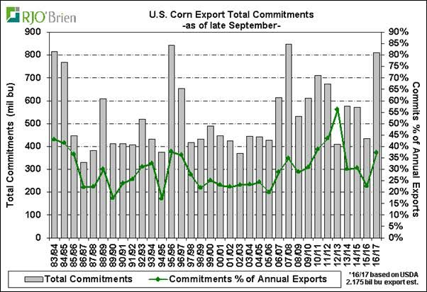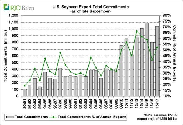 Du côté de la demande, on constate que les ventes à l’exportation sont plutôt « normales » contrairement à celles du maïs. L’engagement des acheteurs totalisent 1.04 milliard de boisseaux ce qui est 30% de plus que l’an dernier et le 2ème plus élevé historiquement. Cependant, la cible de l’UDSA est déjà élevée, les ventes actuelles représentent seulement 52% de la cible de 1.99 milliard ce qui est en dessous des niveaux de 2011/12 à 2014/15. Pour l’instant, l’USDA ne devrait pas toucher à sa cible, mais si la météo est clémente en Amérique du Sud durant l’hiver, on pourrait voir une révision à la baisse au courant de l’année. Cependant, les exportations de tourteau pourraient diminuer demain étant donné les engagements d’achat qui sont les plus faibles en 5 ans ce qui devrait aussi affecter à la baisse la demande de soya pour la trituration.