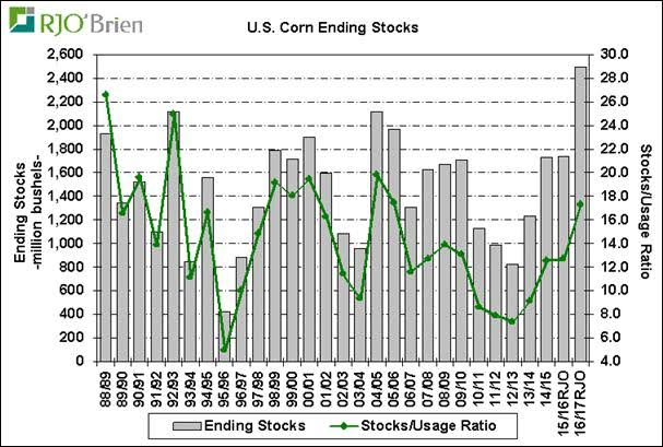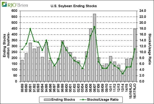 Avec ce bilan, on devrait voir des prévisions d’inventaire autour de 2.36 milliards de boisseaux de maïs pour le 1er septembre 2017. Ce serait les inventaires de fin d’année depuis 1987/88 et le ratio inventaire/utilisation serait entre 16% et 17%, le plus élevé depuis 2005/06. Notre équipe à RJO prévoit des inventaires un peu plus élevés pour la fin de l’année en raison d’une plus faible consommation de maïs dans la moulée.