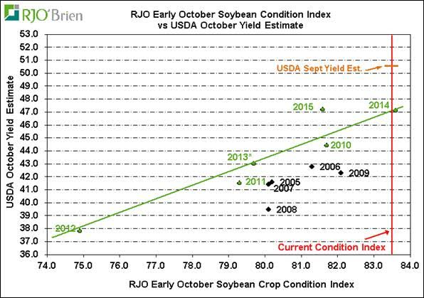 Présentement, le rendement du soya est largement au-dessus des années record précédentes, nous sommes en territoire inconnu. Les attentes sont à 51.5 boisseaux à l’acre contrairement à 50.6 dans le rapport de septembre, ce serait donc une augmentation de la production de 1.8%. Ces attentes semblent très élevées puisque la condition des cultures est similaire à l’an dernier et déjà le rendement du mois de septembre (50.6) était déjà 3.5 boiss./acre de plus qu’en 2015. Si jamais la moyenne des estimés s’avère juste, on connaîtra une production de 4.3 milliards de boisseaux aux États-Unis.