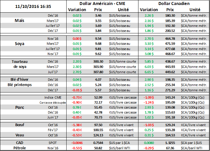 Demain midi, l’USDA publiera son bilan des marchés agricoles où l’attention sera portée sur le rendement des cultures. Les inventaires du début de l’année commerciale 2016/17 seront actualisés selon les données du rapport du 30 septembre. À cela s’ajoutera la production record de cette année. Il ne devrait pas avoir de changement au niveau des acréages, le seul facteur affectant la production sera donc les rendements qui sont prévus pour augmenter dans le soya et diminuer dans le maïs versus le rapport de septembre.
