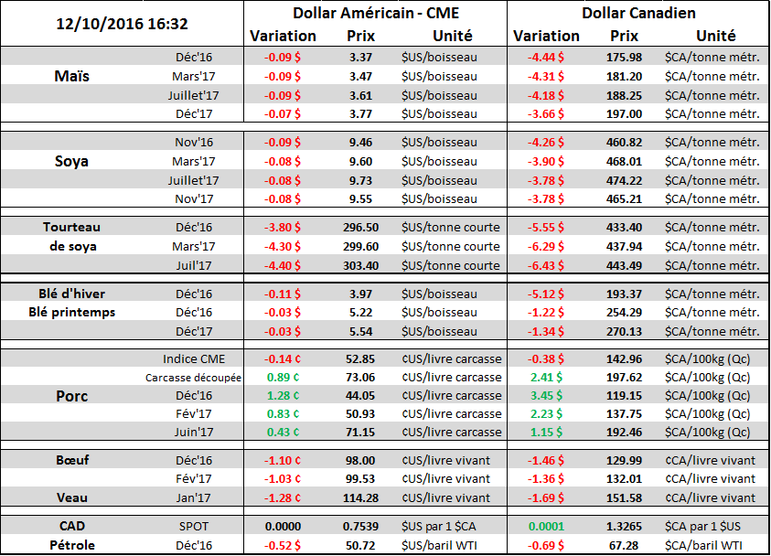 Bref, l’USDA apporte des modifications sommes toutes mineures : un peu moins de production, un peu plus de consommation mais rien d’extravagant. Les inventaires de fin demeurent extrêmement élevés à 2.320 milliard (1.738 pour l’an dernier) et implique donc que le marché sera fort probablement sur le pilote automatique jusqu’en janvier. Certains ajustements seront à surveiller à chaque semaine comme l’export, l’éthanol mais la volatilité dans le marché vient de baisser considérablement. Trop tôt pour commenter l’état des cultures en Amérique du Sud car on est au début des semis, mais cela prendra de l’ampleur seulement à partir de décembre/janvier si un événement majeur survient.