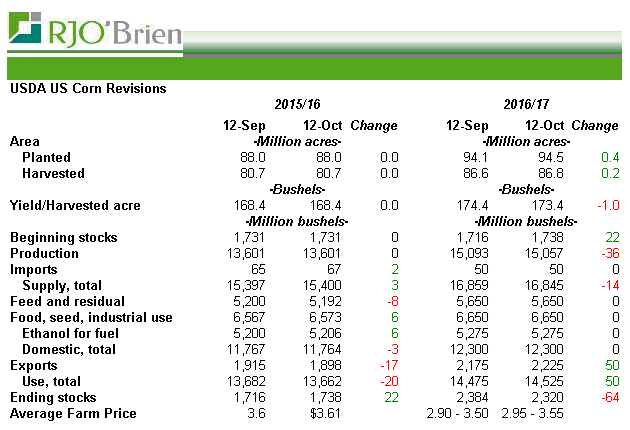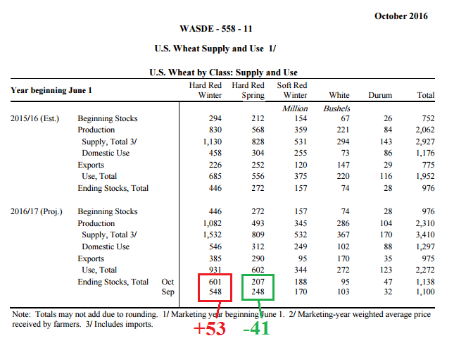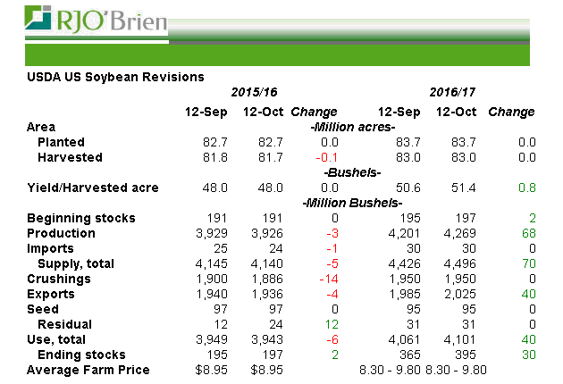 Soja : Au niveau de la production l’USDA hausse le rendement de 0.8BPA en ligne avec les prévisions et ajoutent donc 68 millions de boisseaux à la production qui atteint un record de 4.269 milliard de boisseaux. Quant à la demande, tout se joue au niveau de l’export qui a été revu à la hausse de 40 millions de boisseaux. L’exportation se porte très bien avec plus d’un milliard de boisseaux déjà dans les livres, par contre la cible était déjà « élevée » à 1.985 alors on ne sentait pas réellement le besoin de modifier significativement le programme d’export américain. Au niveau actuel d’exportation (1.040 milliard) cela représente 52% de la cible annuelle et cela est dans les moyennes, voire même un peu en dessous. Comme je dis ce n’est pas complètement fou d’augmenter l’exportation de 40 millions, mais c’est optimiste et peut-être prématuré à ce stade-ci. Par contre, le ministère a régulièrement sous-estimé l’exportation en début d’année et je pense qu’ils tentent de s’ajuster pour 2016/17 pour éviter qu’encore une fois le carry passe de 400 millions à l’automne à 150 quelques mois plus tard à cause d’une demande plus forte que prévue.