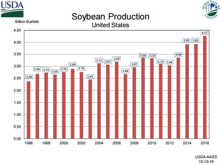 D’ailleurs sur le côté international les inventaires (ending stock) de soja ont bondi massivement passant de 72.17 millions de tonnes à 77.4 million (+7.2%). La principale raison de l’ajustement est une hausse significative des inventaires (production) aux USA, mais aussi au Brésil et Argentine. La production 2016/17 pour l’Amérique du sud est prévue à 168.17 MMT si j’inclus le Paraguay dans le calcul tandis que les américains sont à 116MMT. En augmentant les prévisions d’exportations américaines, on comprend donc que l’USDA fait le pari que les États-Unis seront capables d’aller chercher plus de part de marché sur le commerce international de fève soja.