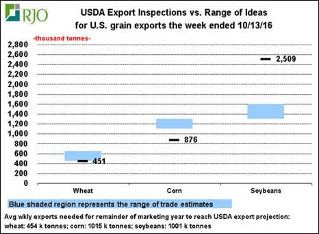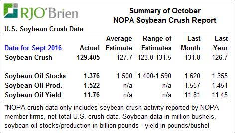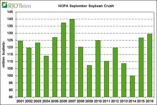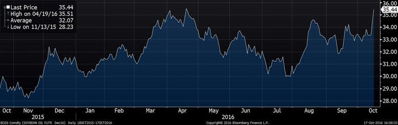D’autre part, les membres de la National Oilseed Processors Association (NOPA) ont consommé 129.4 millions de boisseaux de soya en septembre ce qui est un volume record depuis 9 ans. L’an dernier, les membres de la NOPA avait consommé 126.7 millions de boisseaux et la moyenne des estimés étaient de 127.7 millions. Cela démontre que la demande de tourteau reste forte ce qui est positif pour le prix de la fève soya. Selon la relation entre le NOPA crush et le rapport national fait par l’USDA, la consommation totale de soya pour la trituration devrait être près de 138 millions de boisseaux. Les estimés 2016/17 de l’USDA totalisent 1.95 milliard de boisseaux ce qui représente une augmentation de 3.5% de plus que les volumes de l’an dernier, alors que le NOPA crush de septembre démontre une augmentation de 2.1%. Même s’il y a eu plus de soya trituré qu’anticipé, les inventaires d’huile de soya sont inférieurs aux attentes à 1.376 milliard de livres. Conséquemment, le prix de l’huile de soya a bondit d’une cent la livre (+3%) à 35.44 ¢ pour le contrat de décembre.