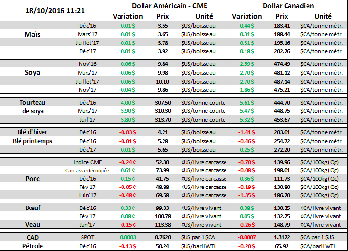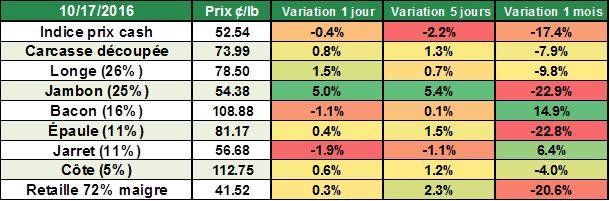 La semaine dernière, les abattages de porc aux États-Unis étaient plus faibles qu’en 2015 par 0.6% à 2.3 millions têtes. Cette baisse de production est principalement expliquée par l’arrêt des opérations de Smithfield Foods en Caroline du Nord en raison de l’ouragan Matthew au début de la semaine dernière. La production s’établit donc à 482 millions lbs, en baisse de 1.7% versus l’an dernier. Il sera intéressant de suivre les abattages de la semaine pour voir s’il les animaux non-abattus de la semaine dernière se retrouveront à l’abattoir de cette semaine. Les abattages d’hier étaient de 441,000 porcs comparativement à 406,000 l’an dernier et 385,000 têtes la semaine dernière.