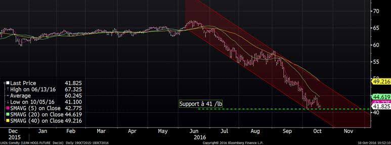 Au niveau technique, le contrat de décembre a vite perdu son petit rebond de la semaine dernière. Actuellement, le CàT de décembre (41.8 ¢/lb) est à moins d’une cent la livre au-dessus des bas de l’année (41¢/lb). Il y a un risque de voir le prix baisser d’avantage si le support à 41 ¢/lb est brisé. Devrait-on vendre si cela arrive ? Il est important de comprendre que cela serait de la pure spéculation puisque nous sommes déjà stabilisés par l’ASRA pour 2016. Pour les 12 prochains mois, la marge est négative à -31 $CA/porc ce qui devrait aussi faire déclencher l’ASRA pour 2017. Les éleveurs porcins n’ont donc pas de risque baissier au niveau actuel qu’en à la baisse du prix du porc, il faut cependant bien prévoir ses liquidités.