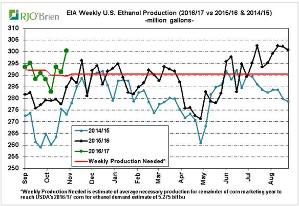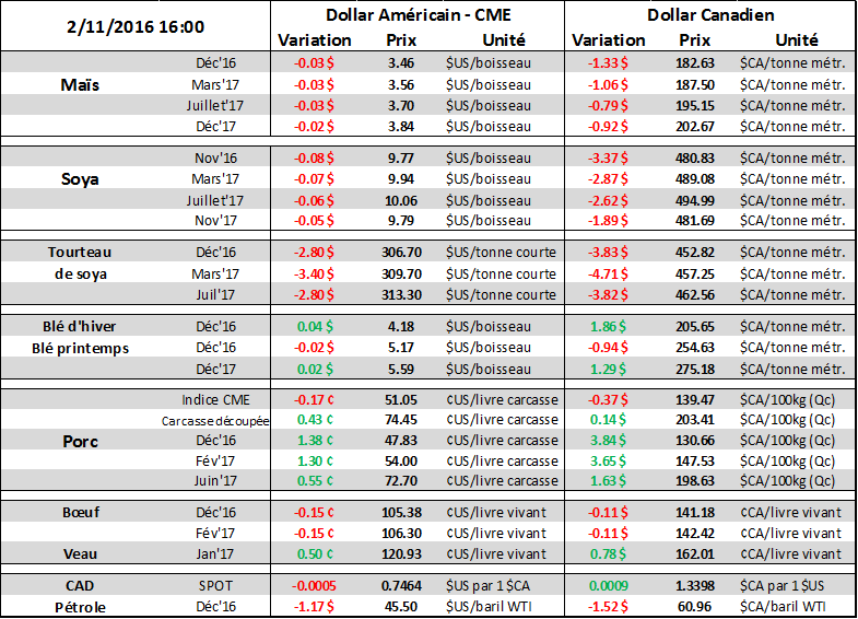 Depuis déjà la mi-octobre, le prix du maïs n’avait plus vraiment de tendance et oscillait entre 3.50 et 3.60 $US/boisseau. Incapable de briser la résistance technique lundi dernier, aujourd’hui nous avons passé sous la barre du 3.50 ce qui demontre une certaine faiblesse dans le prix malgré de bonnes données dans l’éthanol. L’énormité de la récolte américaine refait surface et constitue un frein à court terme pour une explosion du prix. Hier, l’USDA rapportait qu’en septembre, la production d’éthanol avait utilisé 435.2 millions de boisseaux, en baisse versus le mois d’août (458.1M), mais au-dessus des attentes. On continue de voir une diminution considérable de l’utilisation de sorgho avec seulement 4.5 M boisseaux consommés en septembre, contre 7.8M en août et très en-dessous du 21.2 millions de boisseaux en février. Cela est très important dans le calcul de la quantité d’éthanol produit hebdomadairement pour atteindre la cible annuelle de l’USDA. En raison de ce changement de le rendement éthanol/maïs qui est passé de 2.86 gallons/boisseau en août à 2.84 gallons/boisseau en septembre. Le rendement éthanol/maïs moyen était de 2.9 pour la période d’avril à juin. Notre analyste à Chicago prévoit que nous aurons désormais besoin de seulement 0.5 à 1.0% plus de production d’éthanol que l’an dernier pour atteindre la cible de l’USDA de 5.275 milliards de boisseaux de maïs. Actuellement, on roule à 4% de plus que l’an dernier depuis le début de l’année commerciale (1er sept.), on pourrait donc voir un ajustement dans le bilan de l’USDA au cours de l’année si la situation reste telle qu’elle est présentement. De plus, la semaine dernière, la production d’éthanol aux États-Unis est retournée au-dessus de la barre du 1 million de barils par jour, à 1.022 million, tous près des records historiques établient l’été dernier à 1.029 million de barils/jour. Malgré cette grosse production, les inventaires d’éthanol ont reculés de 180,000 barils demontrant que la demande pour la gasoline est très forte. Au final, faut garder en tête que même avec ces nouvelles, le prix du maïs faiblit…