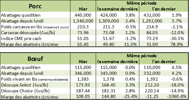 Les marchés cash des CàT du bœuf semblent avoir pris un tournant haussier à court terme. Toutefois, les indicateurs de ralentissement de la demande, en autre l’achalandage des restaurants, ainsi que l’abattage élevé qu’on perçoit à court terme et ajouté à la température idéale qui favorise l’engraissement des bœufs démontrent tous une possibilité de recul prochainement. Le marché a ouvert légèrement à la baisse sur le marché du bœuf gras, les livraisons de décembre sont 0.7 ¢/lb à la baisse alors que les livraisons de l’été prochain sont à la baisse d’un peu plus d’une cent. La baisse est d’avantage marquée sur le prix du feeder qui est à la baisse de presque 3 ¢/lb, perdant une bonne partie du gain de mardi dernier.