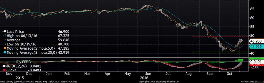 Le marché continue de nous démontrer une tendance à la hausse à court terme, même si une baisse significative peut arriver prochainement en raison du faible écart entre le cash et le CàT de décembre. Il semble difficile d’apercevoir un ajustement du prix des produits de porcs qui reflètent l’abondance d’abattage ces derniers jours. Sur le long terme, il sera important d’augmenter le niveau d’exportation, autrement les consommateurs feront face à une abondance de viande sur les tablettes. Le CàT de décembre a clôturé à la hausse pour terminer à 47.45¢/lb. La marge des abattoirs demeure élevée et les valeurs du porc à la découpe, selon l’USDA hier à la fermeture, sont à la baisse de 2.37¢/lb comparé à mardi pour une valeur de 71.53¢/lb. Le plus bas depuis le 21 Octobre ce qui a causé une baisse de 1¢/lb à l’ouverture du marché de ce matin.