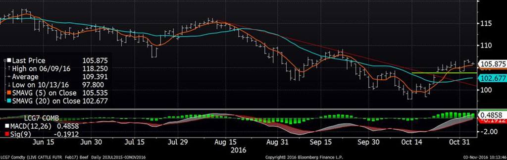 Les prix de la découpe Choice était à la hausse de 1.91¢/lb pour atteindre 187.44¢/lb à la fermeture hier. C’est le plus haut point depuis le 29 septembre. Le CàT de décembre a terminé quelque peu à la baisse pour terminer à 105¢/lb. Il y avait le Federal Cattle Exchange Auction hier et les négociants espéraient y trouver un bon indice de la direction du prix cash pour cette semaine, mais il n’y a eu que 1,224 têtes transigées dans un écart de prix allant de 104¢/lb à 106¢/lb. Il y avait toutefois 12,700 têtes offertes.