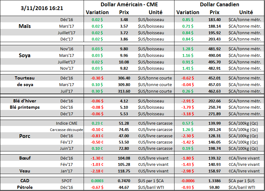 Corn : Solide semaine d’exportation, le rythme demeure très rapide malgré que la semaine dernière était décevante. Jusqu’à maintenant la destination la plus populaire demeure le Mexique avec 7 million de tonnes booké depuis le 1er septembre (28%) des exports totaux jusqu’à maintenant. L’effet « Trump » est assez évidement car les principaux acheteurs de corn américain sont le Mexique et le Japon et pour le moment les Mexicains sont très agressifs sur l’approvisionnement contrairement au Japonais. Comme dans le cas de la fève, il ne serait pas surprenant que l’USDA en profite pour augmenter la cible d’une autre 25 millions de boisseaux. Actuellement à 2.225 milliard.