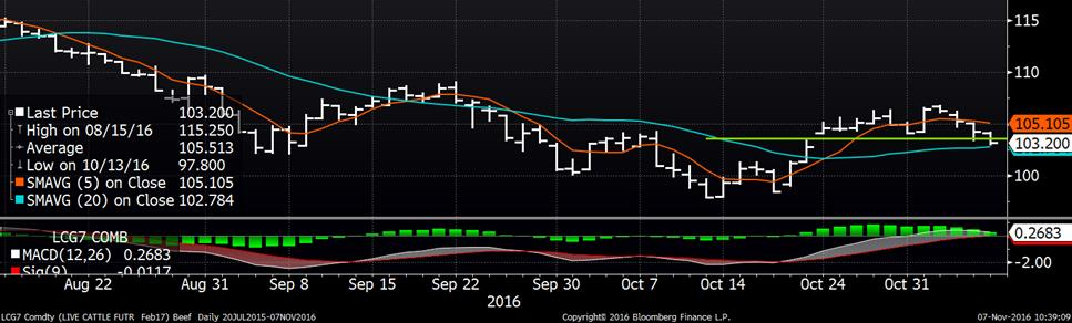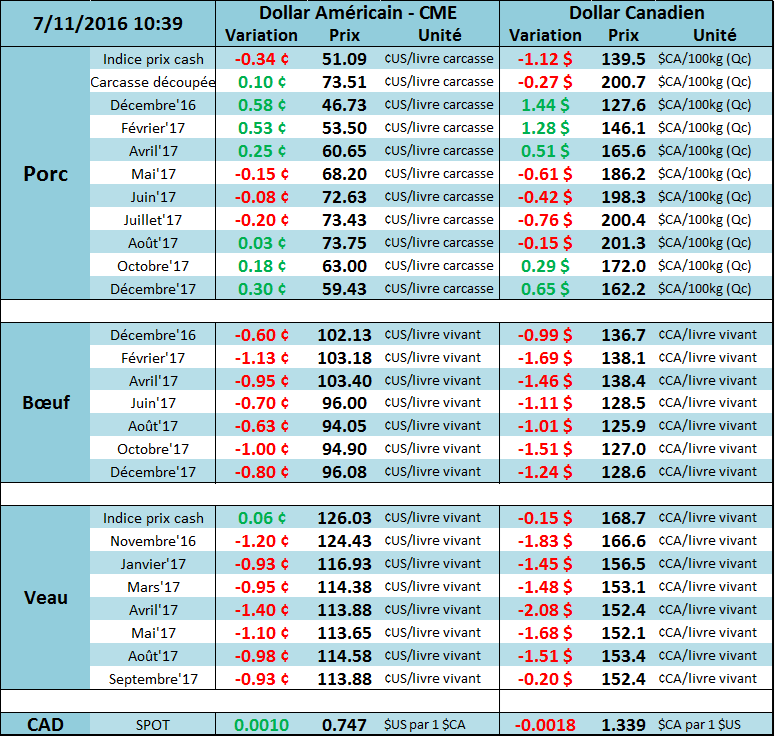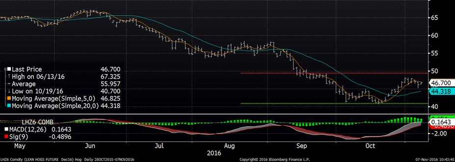 Les sondages de l’élection américaine nous démontrent de plus en plus que Trump ne gagnera pas les élections (Clinton a été blanchi par le FBI) et nous avons vu le Peso américain prendre un fort gain au courant de la nuit, ce qui pourrait être un bon support pour le marché du porc aujourd’hui. Le Mexique est le plus grand importateur de porc américain donc le taux de change avec le dollar américain est un facteur très important, sans oublier des sanctions probables que le Mexique pourraient mettre en place dans ses achats de porc si sa relation avec les É.-U. se détériore.