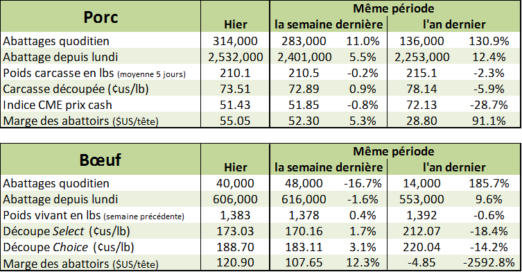 Le prix du marché cash a reculé de 1.00¢/lb sur la semaine dernière, ce qui reflète le niveau d’abattage élevé et les stocks élevés de viande. L’USDA estime le nombre total d’abattage pour la semaine dernière à 606 000 têtes, un recul de 10 000 comparativement au niveau de 616 000 têtes la semaine d’avant.