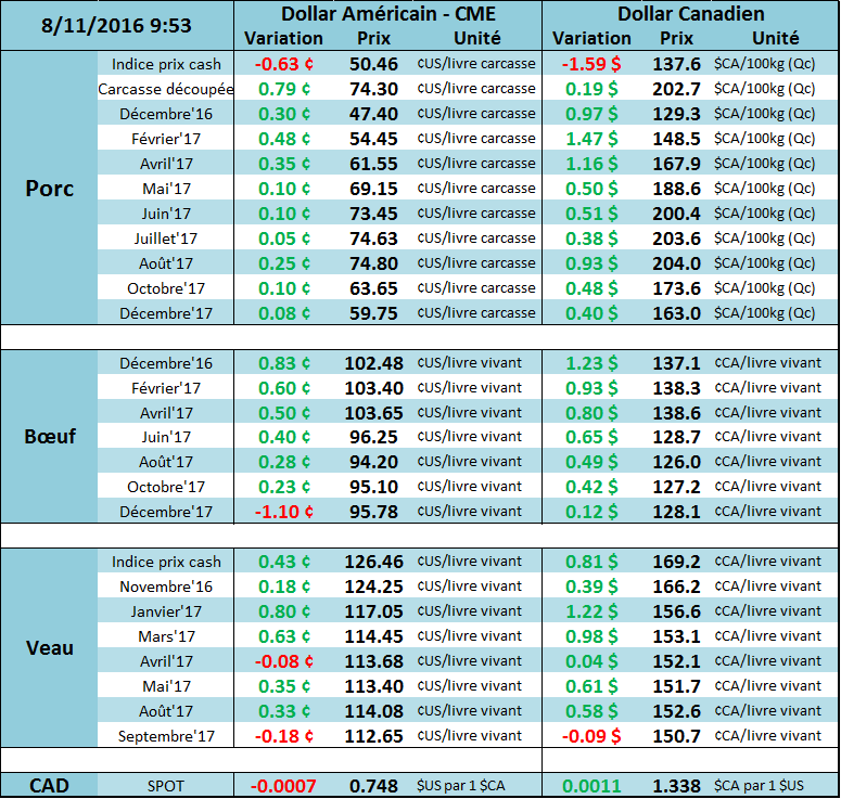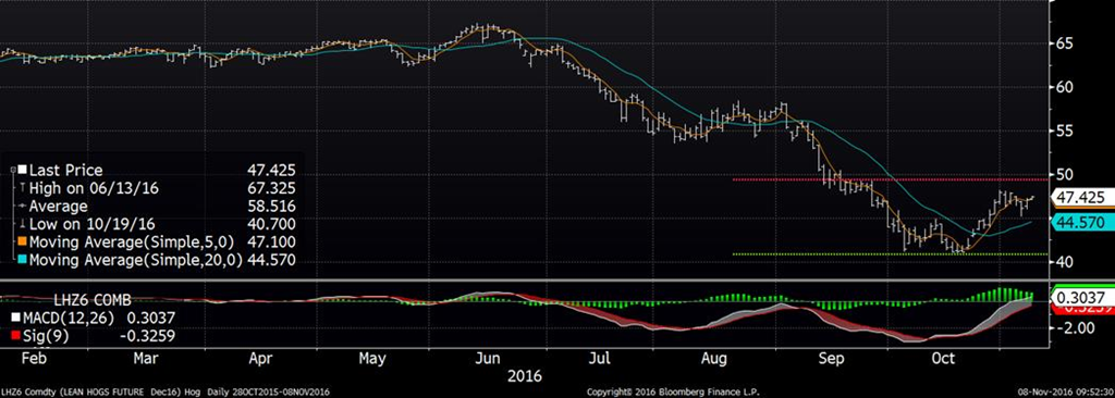 Au niveau des stocks, il y a toujours un surplus à court terme et c’est ce qui profite aux abattoirs puisqu’ils sont en mesures d’acheter du porc à un faible prix au producteur. La marge des abattoirs est toujours bien élevée et même si le niveau d’abattage ralenti, les indicateurs nous montrent que les abattoirs vont continuer à supporter le prix cash. L’indice cash à la CME en date du 3 novembre était de 51.09¢/lb, ce qui laisse le CàT de décembre à une escompte de 4.00¢/lb. Il sera important aussi de voir si la performance d’hier du Peso mexicain continuera aujourd’hui, ce qui pourrait aider le prix des CàT.