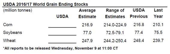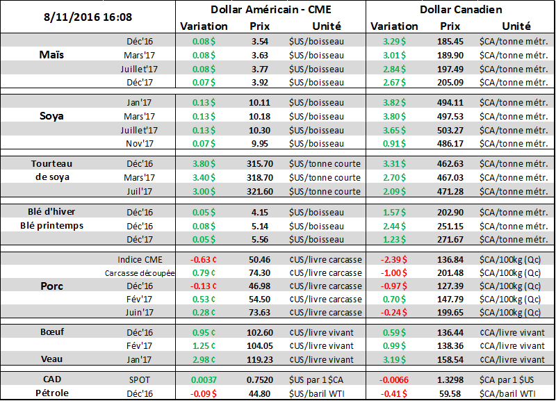 Les prix des grains ont bondi de 1 à 2% aujourd’hui, à la veille du résultat des élections américaines et du rapport mensuel offre/demande de l’USDA. Le rapport de demain midi sera la dernière mise-à-jour de la production américaine avant les chiffres finaux du 12 janvier puisqu’il n’y a normalement pas de changement en décembre. Les yeux seront tournés sur le rendement du soya : presque la totalité des analystes prévoient une autre augmentation. Le rendement du rapport d’octobre s’établissait à 51.4 boisseaux/acre alors que les prévisions pour demain sont entre 51.3 et 52.8 avec une moyenne à 52.0 boisseaux/acre. L’année record continuerait à surpasser les récoltes précédentes! Conséquemment, les analystes s’attendent à une augmentation de la production de fève aux États-Unis, de 4.27 milliards de boisseaux à 4.314 milliards (+1.1%). Évidemment, une plus grosse production de soya engendre des inventaires de fin d’année plus élevée, la moyenne des estimés s’établit à 420 millions de boisseaux comparativement à 197 millions à la fin de l’année commerciale 2015/16.