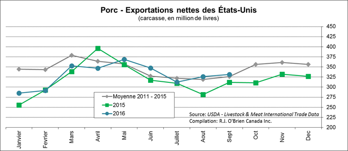 · Exportations nettes de porc en septembre : 331M lbs, soit 6% de plus que l’an dernier