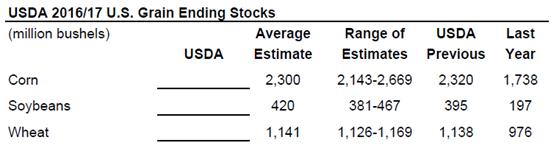 Dans le maïs, moins de changement est attendu. La moyenne est estimés du rendement est similaire à celui rapporté le mois dernier, mais on note que l’étendue des estimés est relativement large (de 171.4 à 175.3 boiss./acre). Récemment, la demande pour le maïs s’est avérée très forte, il faudra aussi surveiller si l’USDA augmentera ses prévisions pour l’éthanol ou l’exportation.