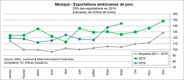 Pour le porc, les exportations américaines en septembre totalisaient 415.7 M lbs dont 35% de ce volume s’est dirigé vers le Mexique et 23% vers le Japon. Cependant, il ne faut pas négliger les importations de 84.4 M lbs dont le trois-quart provient du Canada. Au net, il y a eu 331.3 M lbs de porc qui est sorties des États-Unis en septembre ce qui est 6% de plus qu’en septembre 2015. On ne peut pas dire que les exportations sont mauvaises, nous sommes également au-dessus de la moyenne 5 ans (par un maigre 1.6%). La déception provient encore de la demande chinoise qui reste sous la barre du 40 M lbs alors que leur importation de viande porcine a atteint 308.5 M lbs en septembre soit 88% de plus qu’en septembre 2015. La part des américains ne s’élève qu’à un maigre 13% des achats chinois.