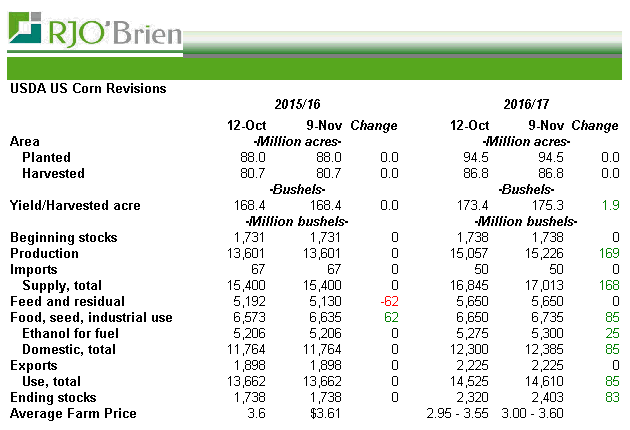 De retour dans notre monde agricole, l’USDA publiait sa mise-à-jour mensuelle de son bilan offre et demande. Les yeux des producteurs, acheteurs ou utilisateurs de grains étaient tous tournés vers le rendement des cultures de maïs et soya. Dans les deux cas, le rendement publié fût bien au-dessus de la moyenne des prévisions. Pour le maïs, l’USDA rapport un rendement de 175.3 boisseaux/acre, soit 1.9 de plus que dans ses prévisions d’octobre et 6.9 boisseaux/acre de plus que l’an dernier. Conséquemment, la production américaine bondit de 169 millions de boisseaux (+1.1%) ce qui est évidemment une récolte record. En raison des faibles prix, la demande devrait utiliser 85 millions de boisseaux supplémentaires ce qui cause une augmentation des inventaires de fin 2016/17 de seulement 83 millions à 2.4 milliards de boisseaux.