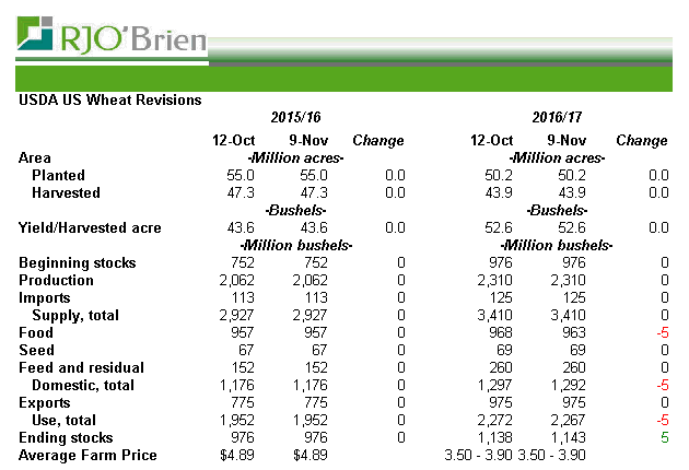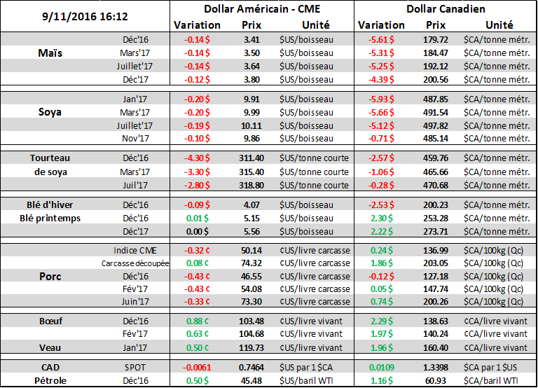 Dans le blé, il y a très peu à signaler, l’USDA n’a pratiquement rien changer et les inventaires de fin d’année 2016/17 sont prévus d’atteindre 1.14 milliard de boisseaux. Toutefois, les baisses de 13 ¢/boiss. et 18 ¢/boiss. du prix du maïs et fève soya respectivement, ont entrainé le prix du blé aussi dans le rouge, terminant la journée à -8 ¢/boisseau.