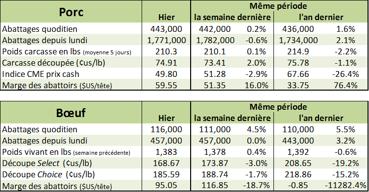Le CàT de février a fait une hausse sur la journée d’hier pour atteindre son plus haut niveau depuis le 31 octobre. Le congé d’aujourd’hui va impacter le niveau d’abattage sur la semaine car certains des plus grands abattoirs seront fermés aujourd’hui en raison du jour du souvenir. Comme sur le marché du bœuf, on a observé une hausse de l’exportation la semaine dernière si on compare au niveau des 4 dernières semaines.