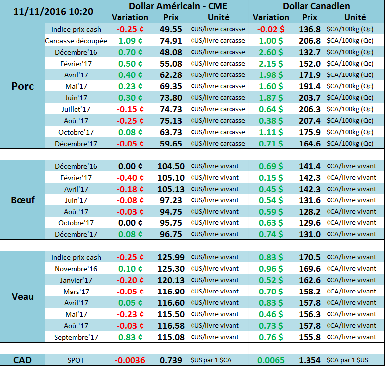 Les marchés sensibles comme le cuivre, le coton ou les obligations démontrent que les changements au plan fiscal pour 2017 favorisent les consommateurs à dépenser ce qui serait également favorable pour la consommation de protéine. Ce qu’on peut observer de la journée d’hier, c’est que le marché semble avoir un bon support et signe d’augmentation de la demande ou de ralentissement des abattages qui pourraient renverser la tendance et emmener le marché à la hausse. Par contre, faudra surpasser deux petites résistances à court terme soir les sommets du début novembre et mi-septembre. Le CàT de février a terminé légèrement à la hausse hier pour faire des hauts sur les 5 derniers jours. Contrairement à hier où on mettait l’emphase sur la possibilité de baisse des exportations et la faiblesse du peso mexicain, aujourd’hui on peut apercevoir un regain de la demande, soit plus d’argent dans les poches des consommateurs… comme quoi le marché ne sait plus dans quel sens aller depuis les élections. Le prix du bœuf à la découpe a terminé à 185.59$/lb hier, légère baisse sur la semaine d’avant. Au Texas, le marché du prix cash était à 102$/lb par 107$/lb, ce qui nous montre une fois de plus la volatilité du marché.