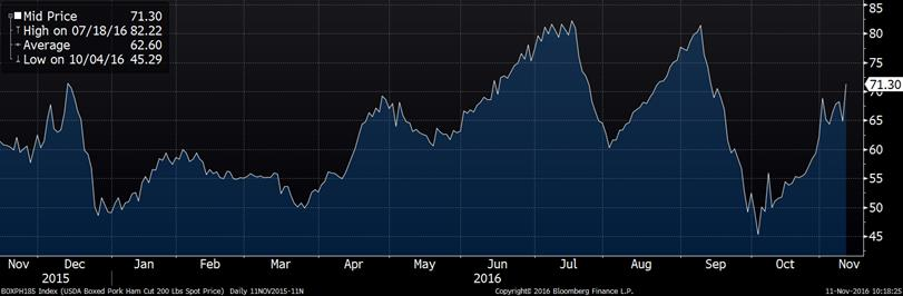 Sur le marché du porc, malgré que la venue de Trump laisse sous-entendre une baisse des exportations et qu’on note une forte baisse de la valeur du peso mexicain, le prix des CàT continue d’augmenter. Encore une fois, on se doit de mentionner la volatilité des marchés et surtout l’incertitude qui plane suite à la nomination de Mr.Trump. Après la fermeture des marchés hier, l’USDA a indiqué le prix à la découpe à 74.91$/lb, en hausse de 1.09$/lb depuis mercredi. Le plus haut niveau depuis le 28 septembre. C’est le prix du jambon qui propulse le prix de la carcasse découpée, cette coupe représente le quart de la carcasse et comme le démontre le graphique ci-dessous, la demande en prévision de la Thanksgiving est très forte.