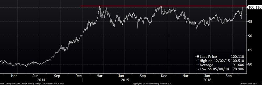 Contre toutes attentes, le dollar américain s’est fortement apprécié depuis la victoire de Trump. Le dollar américain est tellement fort depuis une semaine que l’indice du dollar américain est allé rejoindre les sommets de 2015, juste au-dessus de 100. Face à cette vague haussière, l’ensemble des paires de devises contre le $US ont baissé, notamment le dollar canadien, le peso mexicain et le real brésilien, 3 devises qui nous préoccupent dans le monde agricole. D’une part, le dollar canadien a touché aujourd’hui un nouveau bas depuis le printemps dernier, à 0.736 $US par 1$CA. Une tendance baissière semble bien s’installer avec une 4ème journée consécutive de baisse et les moyennes mobiles 50 – 100 – 200 jours sont toutes enlignées pour une tendance négative à long terme. Pour sa part, le peso mexicain demeure à sa plus faible valeur face au $US depuis sa création ce qui pourrait affecter les exportations américaines vers le Mexique… Il reste à voir si le dollar américain continuera à s’apprécier ces prochaines semaines pour surpasser les sommets de 2015. Techniquement, la zone 100 – 100.5 sur l’indice du dollar américain sera la résistance à percer pour une continuation du momentum actuel.