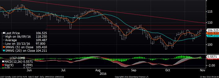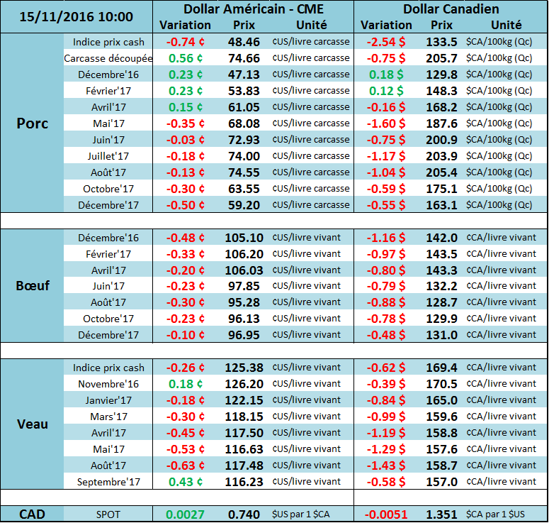 Les prix CàT du bœuf gras ont terminé majoritairement à la hausse hier, mais ont quand même déçu après avoir touché des niveaux plus hauts dans la journée. Le CàT de décembre a terminé la journée de lundi avec 0.025¢/lb à la baisse pour atteindre 105.575¢/lb alors que février a terminé avec 0.23¢/lb de hausse pour un niveau à 106.525¢/lb. Sur avril, le CàT a fermé à 106.225¢/lb, en hausse de 0.13¢/lb. Les prix à la découpe ont variés dans des sens opposés hier, le Choice à la baisse de 0.70¢/lb pour se situer à 183.92¢/lb et le Select en hausse de 0.01¢/lb pour se situer à 167.72¢/lb.