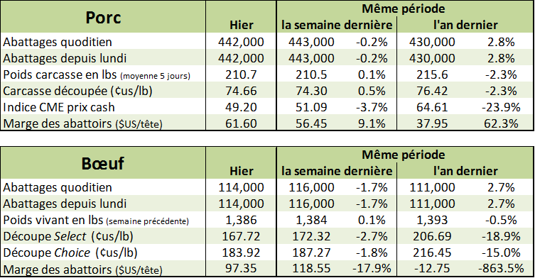 Le prix de la découpe du porc était à la hausse de 0.56¢/lb pour atteindre 74.66¢/lb. Le prix cash venant de l’Iowa-Minnesota était à la baisse de 0.10¢/lb hier sur la journée et l’indice de la CME pour vendredi était de 48.46¢/lb (-0.74). La marge des abattoirs se situe à 61.6 $US/tête.