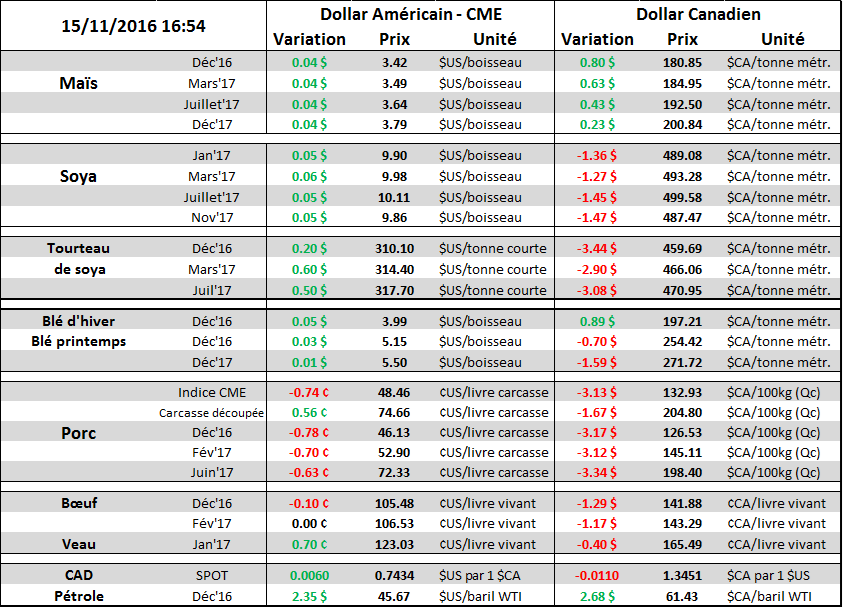 En somme, le rapport de la NOPA était légèrement positif pour le prix du soya puisqu’il démontre une forte demande de la part des triturateurs. Cependant, c’est légèrement négatif pour le tourteau étant donné l’énorme production. Le prix de la fève soya a terminé la journée à la hausse de 0.75%, le tourteau à la hausse de 0.3% et l’huile de soya à la hausse de 0.9%, tous pour les livraisons de janvier.