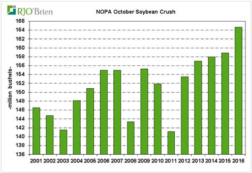 La NOPA a rapporté que ses membres ont trituré en octobre 164.6 millions de boisseaux de soya, bien au-dessus de la moyenne des attentes du marché de 160.5 millions et mieux que les pronostics les plus élevés à 163.1 millions. De plus, la consommation de soya des triturateurs en octobre a nettement dépassé le volume de l’an dernier de 158.9 millions, même que c’est le volume le plus élevé historiquement pour un mois d’octobre et le 3ème tous mois confondus (après les 165.4 millions en décembre 2013 et 2014). Dernièrement, les membres de la NOPA représentaient 93.7% de la production de tourteau et d’huile de soya aux États-Unis. En extrapolant, on peut estimer la consommation américaine de soya pour la trituration à 314 millions de boisseaux pour septembre et octobre versus 305 millions l’an dernier. Conséquemment, la consommation de novembre à août aurait besoin d’être seulement 2.2% au-dessus des niveaux de l’an dernier pour atteindre la cible de l’USDA de 1.93 milliard de boisseaux de soya, alors que nous étions à +2.9% en septembre et octobre.