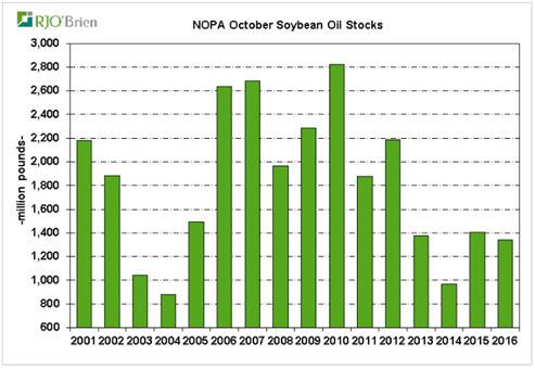 Par ailleurs, la NOPA a rapporté que ses membres ont produit 1.91 milliard de livres d’huile de soya, bien au-dessus du 1.53 milliard de septembre et de la quantité de l’an dernier à 1.844 milliard. La production d’huile en octobre vient établir un nouveau record, surpassant la production mensuelle record précédente de 1.897 milliard en décembre 2013. Le rendement moyen était de 11.61 lbs/boisseau, en baisse comparativement à septembre à 11.76. Malgré le rebond de la production d’huile, les inventaires ont diminué de 0.033 milliard de livres d’huile depuis septembre à 1.343 milliard. Cependant, le marché s’attendait à une diminution des inventaires d’huile en raison des faibles inventaires d’huile de palme en Malaisie.