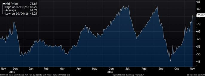 · Le rebond du prix du jambon a propulsé la valeur du porc découpé à 76¢ à la mi-journée