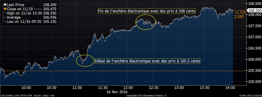 · Enchère électronique de bœuf : le prix cash a monté jusqu’à 108 ¢/lb et le marché à terme a suivi la tendance journalière
