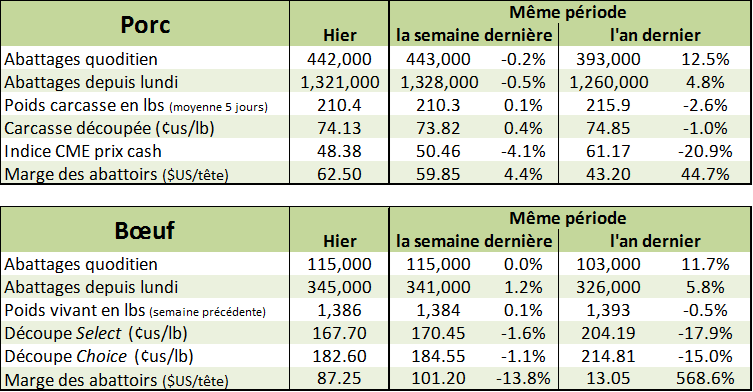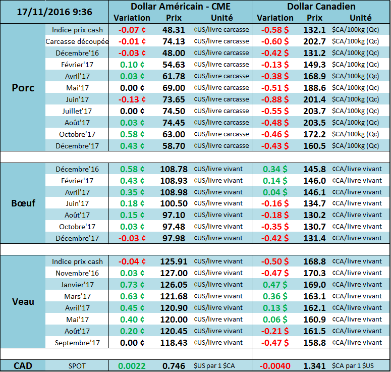 Sur le marché du porc, les CàT ont tous été à la hausse sur la journée d’hier. Décembre a enregistré une hausse de 1.90¢/lb alors que février a augmenté de 1.625¢/lb et avril à 1.525¢/lb pour terminer la journée respectivement à 48.025¢/lb, 54.525¢/lb et 61.75¢/lb. On observe peu de changement depuis la semaine dernière dans les prix alors qu’on se trouve à moins de 1.00¢/lb des niveaux de la semaine dernière.