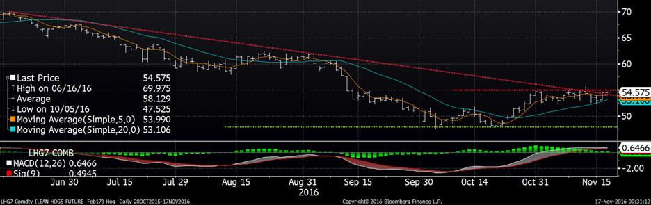 Le rapport Cattle on Feed sort demain. La chose à observer est surtout de voir si le niveau de placement en parc d’engraissement suivra les attentes. Advenant plus de placement qu’attendu, il faudra s’attendre à une baisse du prix des CàT sur juin et août. Les CàT du boeuf gras ont continué leur tendance haussière des derniers jours et atteignent des hauts sur près de deux mois ce qui semble la prochaine résistance à briser. Sur décembre, la fermeture d’hier a été enregistrée à 108.20¢/lb, une hausse notable de 2.725¢/lb sur la journée et sur février, une hausse de 1.975¢/lb du CàT pour terminer à 108.50¢/lb et dépassant la moyenne mobile 100 jours. La prochaine résistance à briser est le haut de septembre à 109.125¢/lb. Le CàT à terme d’avril se situe à 108.625¢/lb. Ce qui a alimenté les marché hier, c’est surtout l’encan électronique au cours de la journée avec de prix cash à 105.50 en début de séance pour finir à 108.25 ¢us/lb.