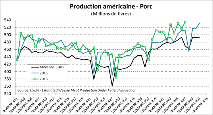 · Production hebdo de porc : +4.6% à 534.3 millions lbs avec 2.53 millions de porcs abattus