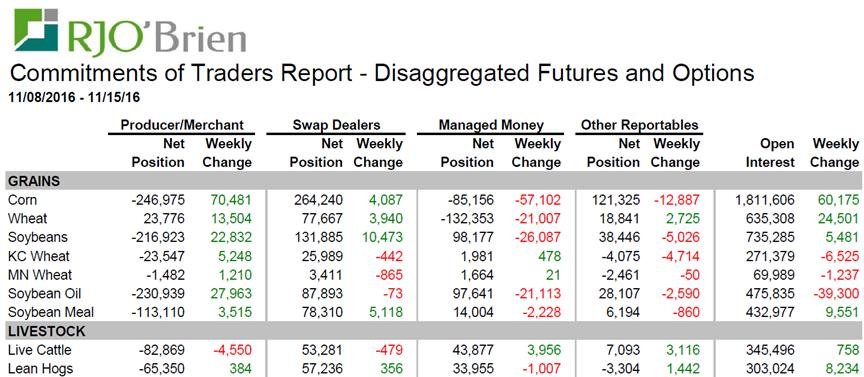 Concernant les spéculateurs, ils ont vendu des céréales entre le 8 novembre et le 15 novembre, fort probablement en raison du rapport mensuel USDA qui démontrait des rendements supérieurs aux attentes. Ils ont vendu au net 57 102 CàT de maïs, 21 007 de blé d’hiver, 26 087 de soya et 21 113 CàT d’huile de soya. Dans les viandes, les changements sont mineurs avec un achat net de presque 4000 CàT de bœuf et 1000 CàT vendus dans le porc.