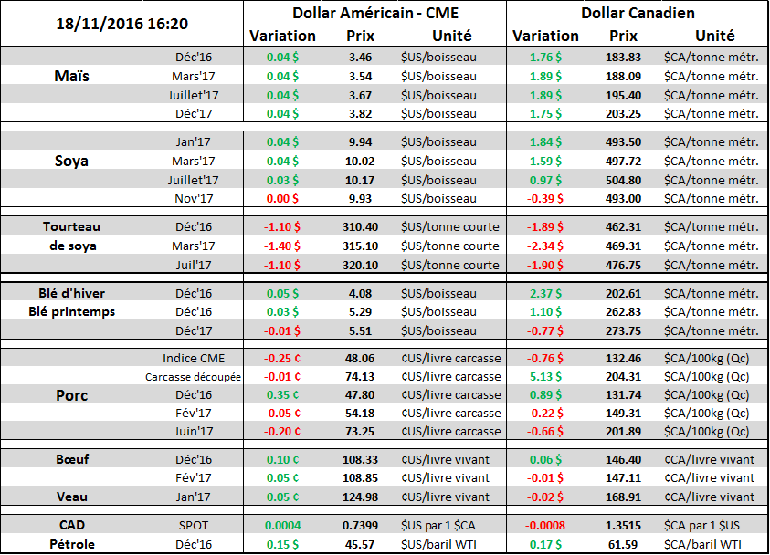 · Les spéculateurs ont vendus du grain, peu de changement dans les viandes