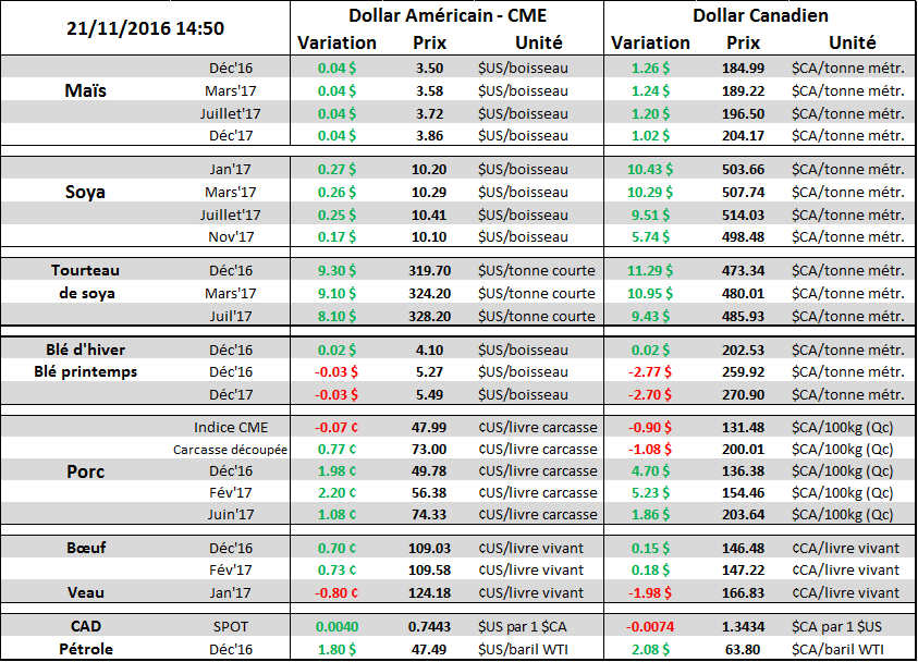 Dollar/Pétrole : Malgré les élections américaines le dollar américain demeure TRES fort avec l’indice USD Index passant au-dessus des 100 points la semaine dernière. Techniquement le Dollar Index est sur une lancée ; le MACD montre un gros signal d’achat le 11 novembre et depuis les cours suivent une tendance haussière qui explique le RSI élevé. Le marché anticipe maintenant que la FED haussera les taux en décembre d’un quart de point. En fait, les traders utilisent une quasi-certitude à ce niveau car les probabilités implicites d’une hausse sont à 95.4%. La hausse du huard aujourd’hui est plutôt attribuable au pétrole qui bondi de plus de 4% en route vers un retour au-dessus de 50$ le baril. La hausse des prix est en lien avec les discussions sur la prochaine rencontre de l’OPEP le 30 novembre prochain et l’interminable débat sur la possibilité de réduire/couper la production afin de contrôler l’offre. Techniquement il y a beaucoup de bruit autour de 46.50$ un niveau pivot entre support et résistance depuis deux semaines. Le RSI donne suffisamment de jus pour revenir sur les résistances à 52$ - à suivre…