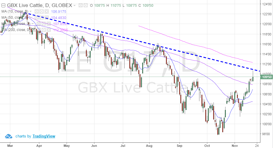 Bœuf : rapport sur les bœufs en parc d’engraissement on attendait l’ouverture des marchés ce matin à savoir quelle sera la réaction face au rapport neutre. Comme Gabriel le disait dans le commentaire de vendredi, le rapport était considéré comme neutre par rapport aux attentes, donc le mouvement d’aujourd’hui est donc le prolongement du rebond à partir des bas du mois d’octobre. Pour l’instant le marché conserve la tendance négative mais certains éléments tournent tranquillement vers un renversement de cette lourde tendance. Les prix ont franchis les moyennes mobiles 10 et 50 jours et même celle de 100 jours la semaine dernière, chose qu’on a très rarement vu au cours de la dernière année. On surveille si les cours sont capable d’aller traverser la ligne de tendance actuellement autour de 111. Une fermeture au-dessus de la tendance long terme (moyenne mobile 200 jours) serait définitivement un signe positif pour le marché. D’un point de vue graphique, bien entendu. On reste extrêmement prudent dans ce marché car la dernière fois qu’on est allé jouer dans cet environnement technique en aout, les prix ont dégringolé par la suite de 14 cents en moins d’un mois.