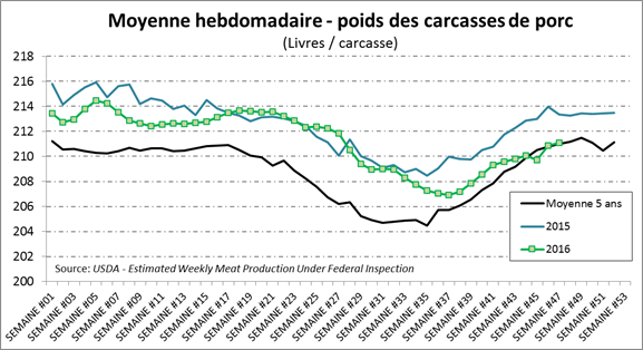 Les prix sont stables ce matin permettant de préserver les gains d’hier. Le marché semble prendre pour acquis qu’il n’y aura pas de problème pour abattre le volume de porc en décembre. Les semaines à 2.5 millions de porcs semblent provenir d’un devancement des livraisons ce qui explique partiellement la chute des poids relativement à l’an dernier. Aussi, il ne faut pas négliger que les faibles prix n’incitent pas à maintenir le poids trop élevé.