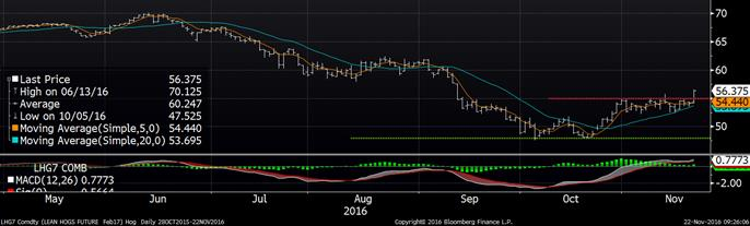 Bonne hausse hier du marché à terme de porc alors que des hauts de 2 mois ont été atteints, brisant ainsi la résistance horizontale. Sur décembre, une hausse de 1.975¢/lb sur la journée d’hier pour atteindre 49.775¢/lb, une hausse de 2.20¢/lb sur février pour atteindre 56.375¢/lb avec la prochaine résistance qui se situe à 56.885¢/lb, soit la moyenne 100 jours. Le CàT d’avril a terminé la journée à 62.625¢/lb. Le prix de la carcasse découpée était à la hausse également hier pour terminer la journée à 73.49¢/lb (+0.49) grâce à un gain notable pour l’épaule (+6.3%). Le prix cash de la journée du 18 novembre était de 47.60 (-0.32) ce qui donne un indice CME à 47.72¢/lb (-0.27). Selon HedgersEdge, la marge des abattoirs se situe à 61$ la tête.